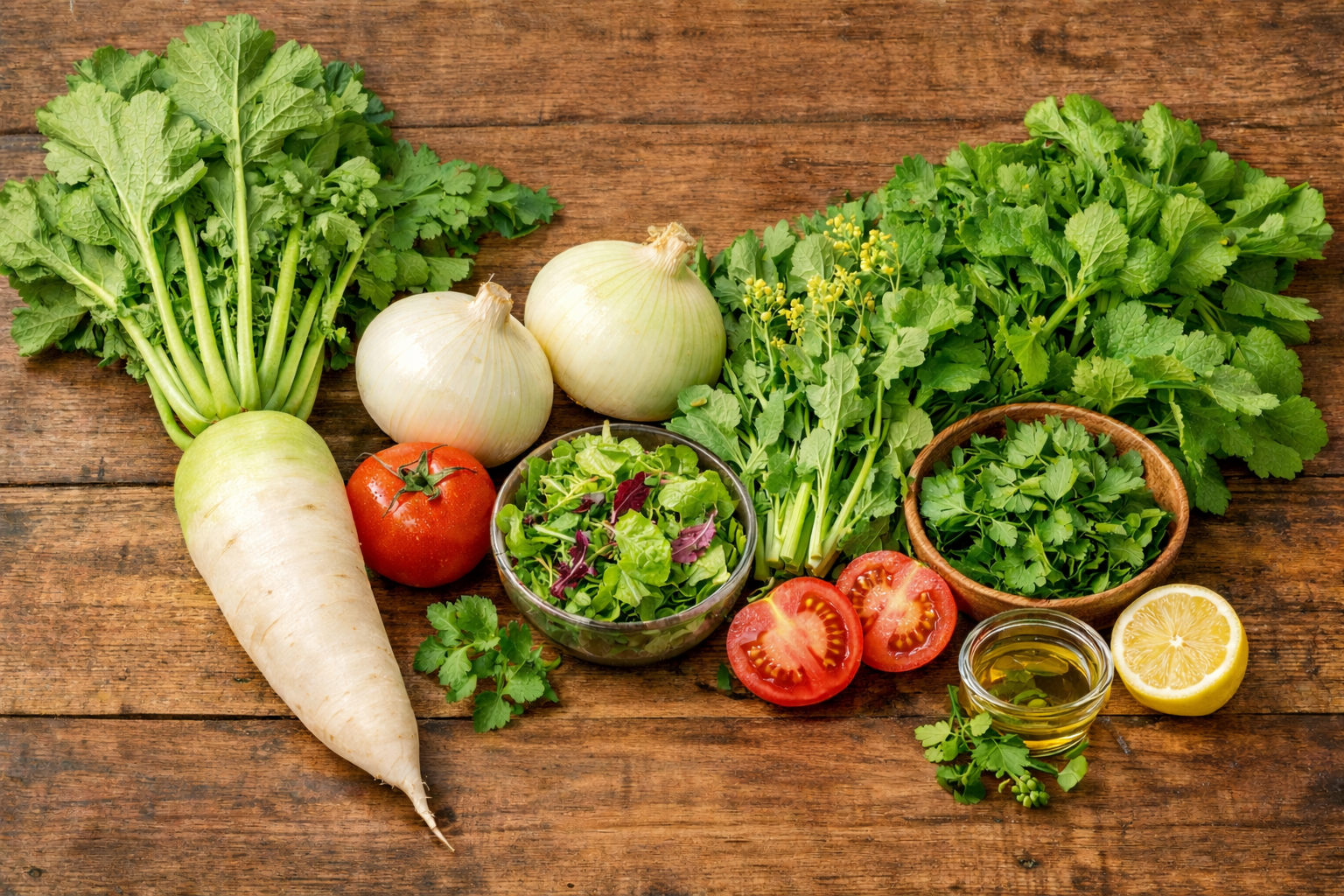 新玉ねぎの甘み、大根のさっぱり感、のらぼう菜のほろ苦さ、そしてトマトやハーブの爽やかさ。食卓に並べるだけで、春の訪れを感じられるラインナップです。